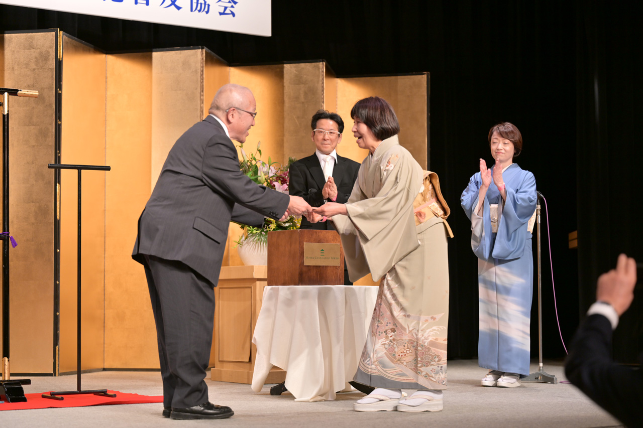 表彰式は当協会元名誉総裁三笠宮妃百合子殿下の御孫様の彬子女王殿下に御台臨いただき、また三笠宮妃百合子殿下の御長女 近衛甯子様も御参加のもと開催され、当協会からは、学長の武田富枝先生がきもの文化賞受賞、ほか10名の先生方がきもの文化功労賞を受賞されました。