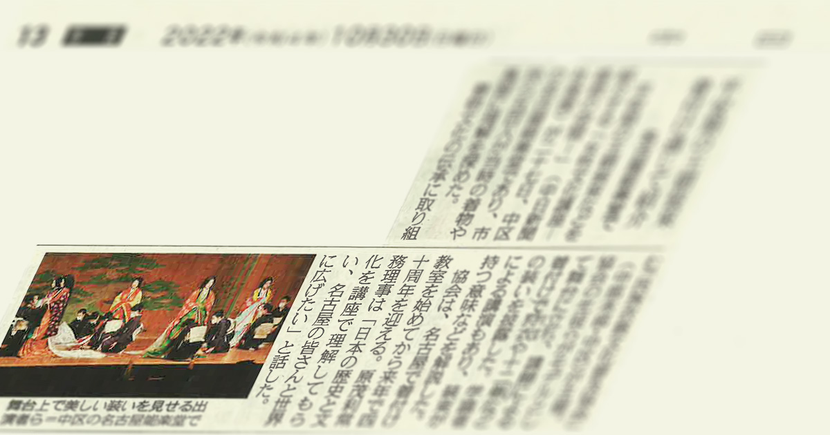 10月27日(木)名古屋能楽堂にて開催いたしました女性文化講座「姫君の空間」に500名が来場し王朝装束の着装実演や解説を楽しむ様子が中日新聞に掲載されました。